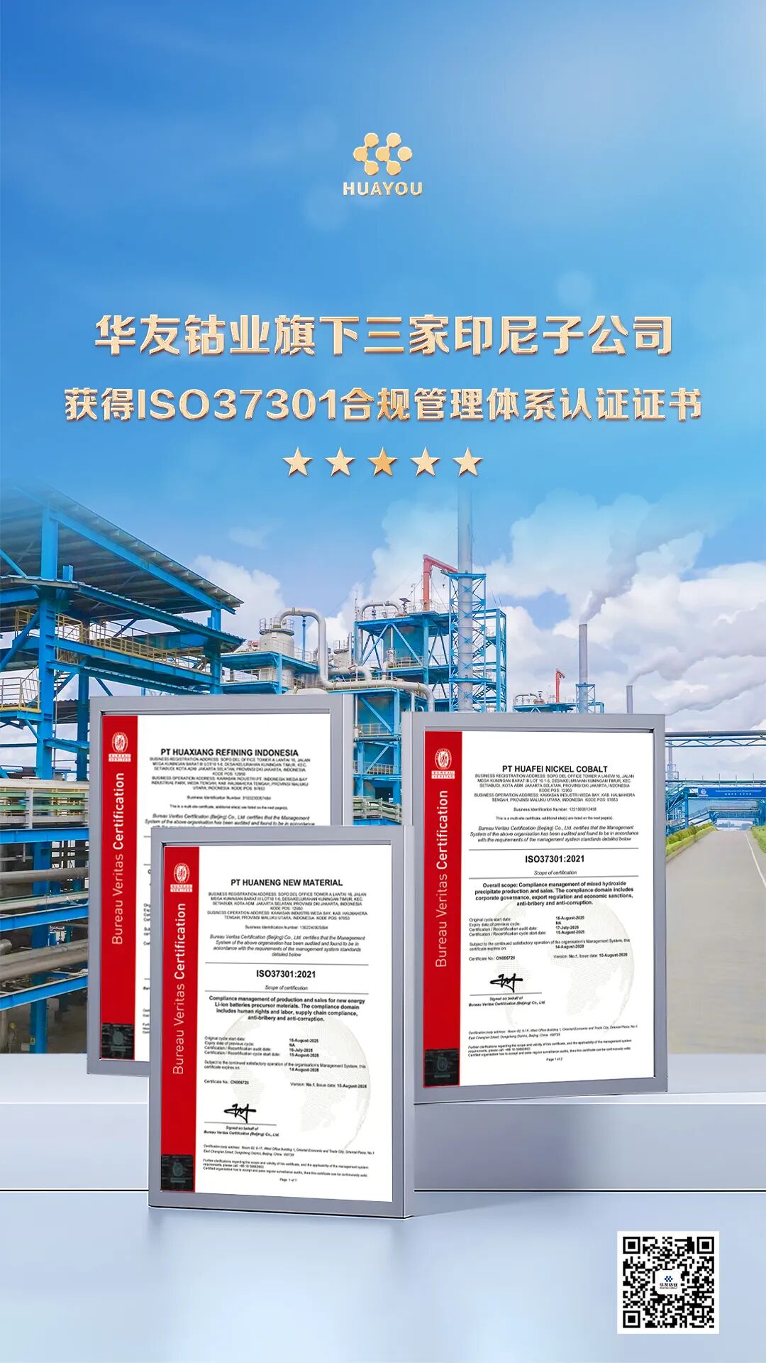 9月12日 ,華友鈷業旗下三家印尼子公司——華飛鎳鈷(印尼)有限公司、華翔精煉印尼有限公司、華能新材料有限公司正式獲得必維集團(Bureau Veritas)頒發的ISO 37301合規管理體系認證證書。這標志著華友鈷業印尼新能源鋰電材料一體化產業基地全面接軌國際合規標準,為全球化發展奠定了堅實基礎。